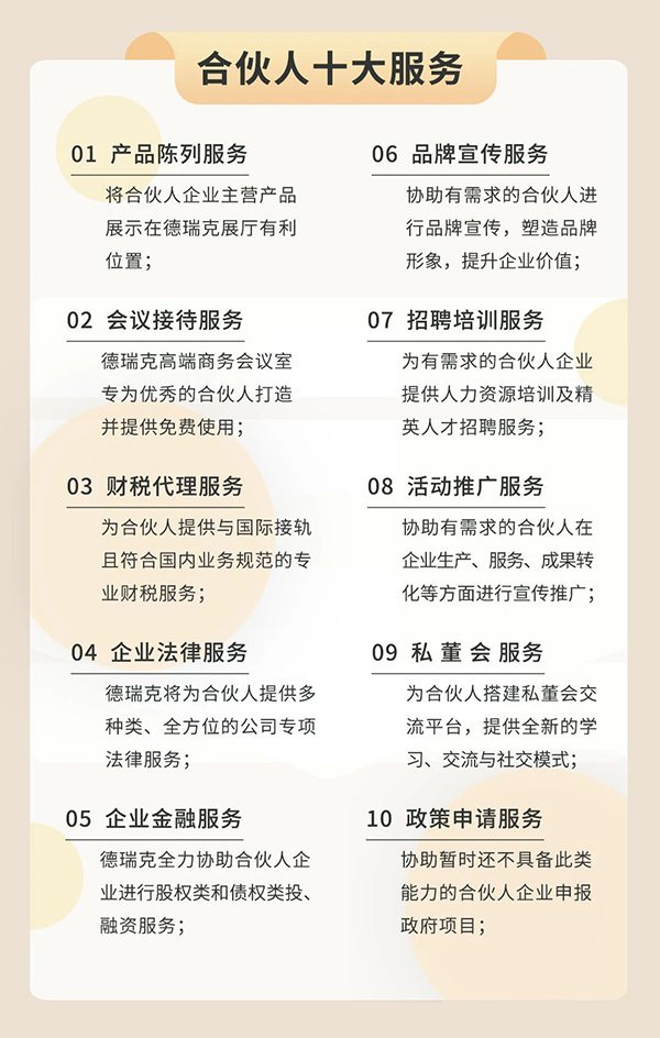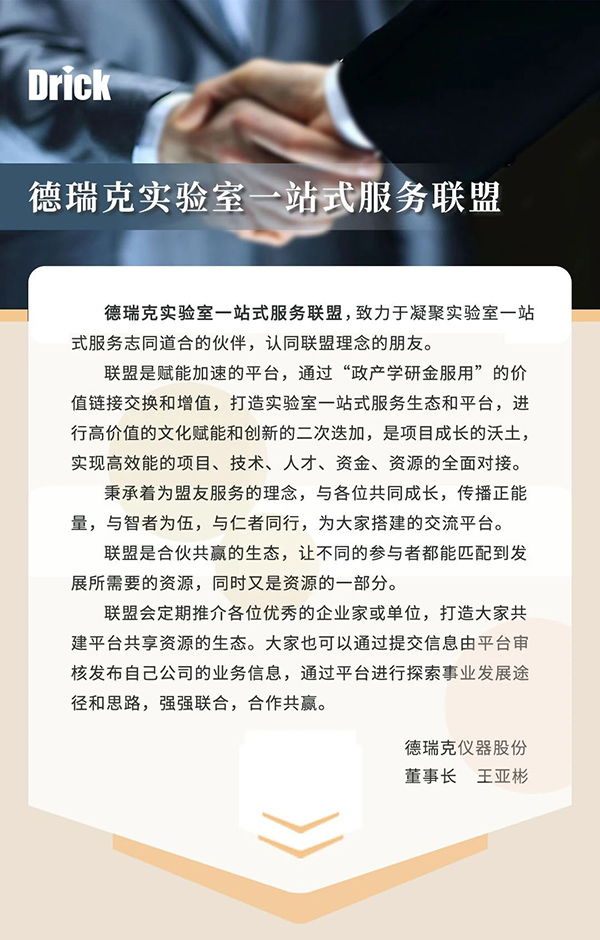 德瑞克實驗室一站式服務聯盟,致力于凝聚實驗室一站式服務的核心戰友、志同道合的伙伴,認同聯盟理念的朋友。通過政產學研金服用的價值鏈接,打造實驗室一站式服務生態和平臺,讓不同的合作機構,單位,企業,個人得到發展的機遇和發展的空間。聯盟是一個生態,讓不同的參與者都能匹配到發展所需要的資源,同時又是資源的一部分。此外,聯盟還會定期推介各位優秀的企業家和其企業的主營業務,打造“共建平臺、共享資源"的聯盟新生態。