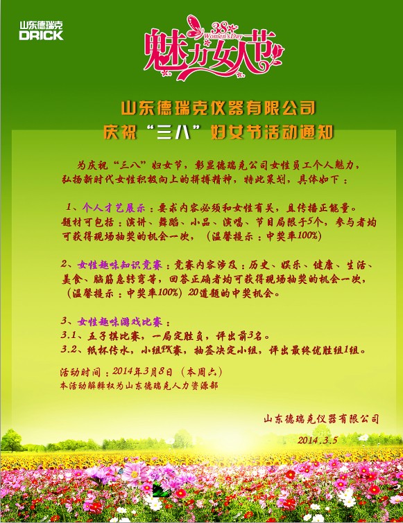 我國于1949年12月規定每年的3月8日婦女節,迄今為止已有60多年的歷史,而今年恰逢是三八婦女節第65周年。為了活躍企業文化氛圍,表彰和感謝女同胞們為公司做出的貢獻,山東德瑞克儀器有限公司決定于3月8日為所有女員工準備了一系列別開生面的歡慶活動,在表彰和感恩的同時也為德瑞克女同胞們展示個人才藝,彰顯女性風采提供了一個良好的舞臺?;顒泳唧w內容如下: